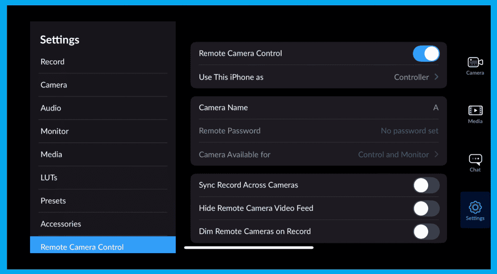 | Copy Settings | Send iPad camera settings to iPhones |